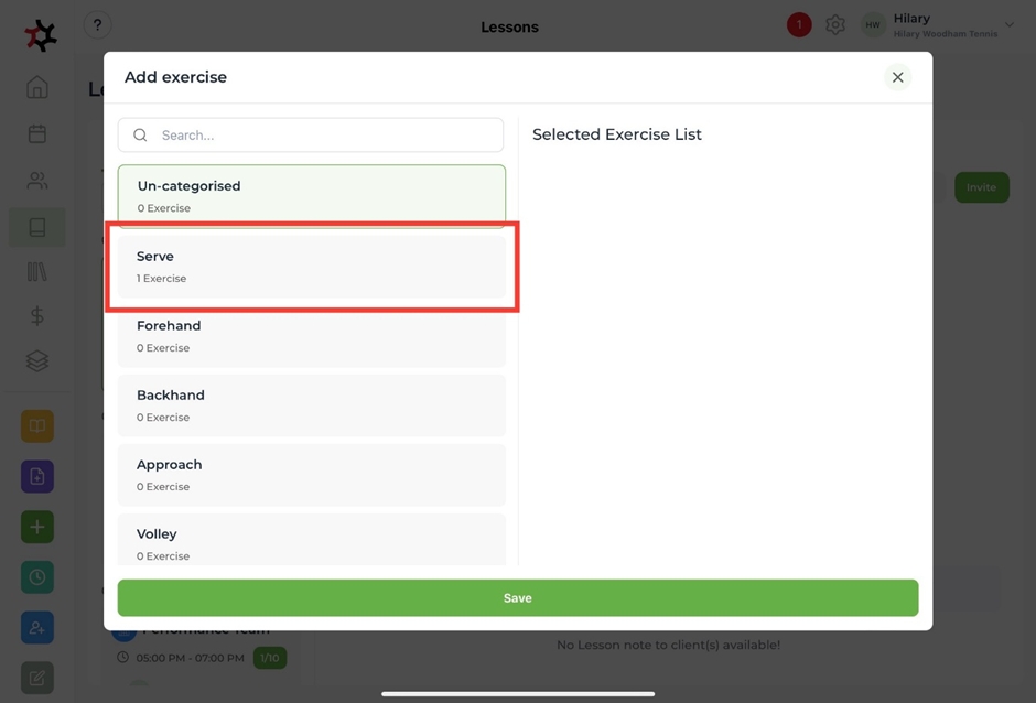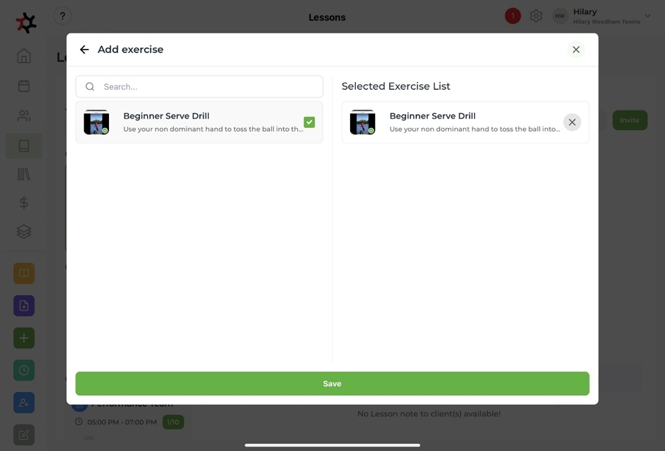 Select the exercise and Save. This will load the exercise into the lesson where the athlete(s) can view it.