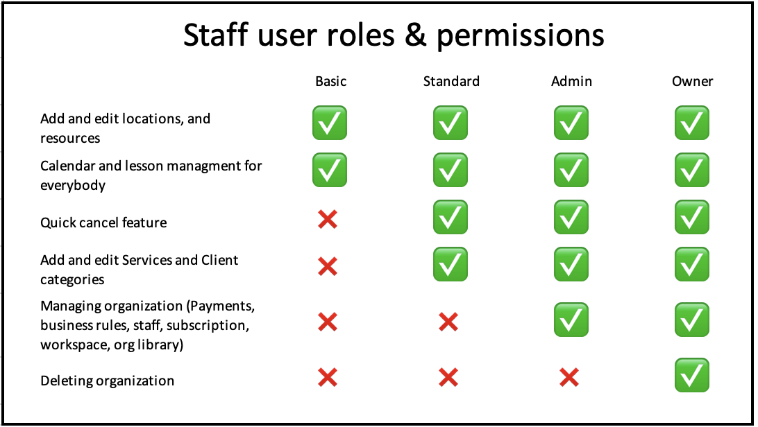 Standard - A coach for your organization is likely to be set as Standard. This enables the coach to be able to add services, add and edit lessons, input exercises and notes for their client(s), be bookable online and view staff calendars. They will not be able to edit other staff, edit locations, change payments or business rules and settings within the organization.