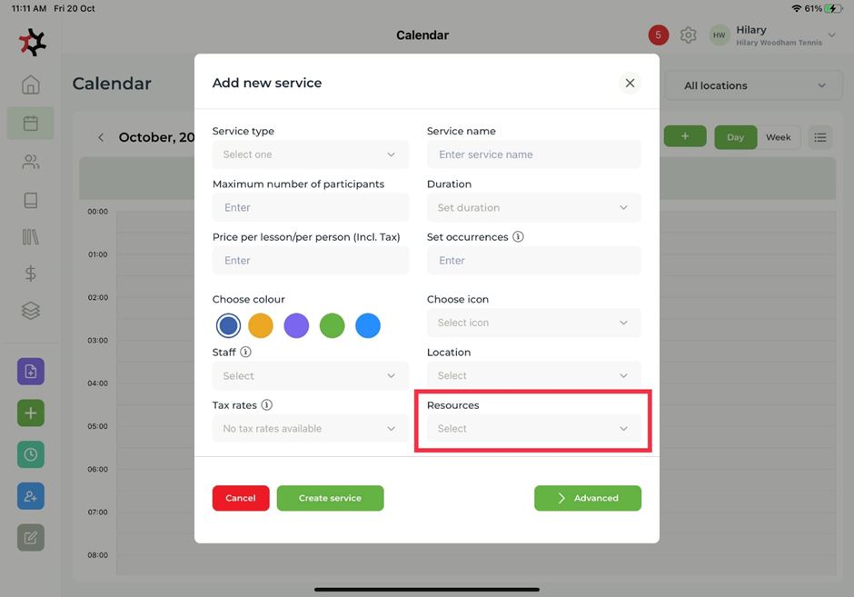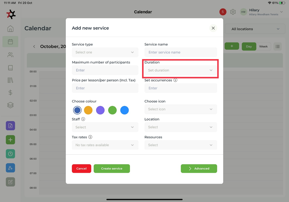 7. If you have selected a package, programme or event as your service type you will then need to set the amount of **Occurrences**. You can then edit the occurrences under the **Advanced** section. If you have selected **Lesson** as your **Service type** you can skip this step.