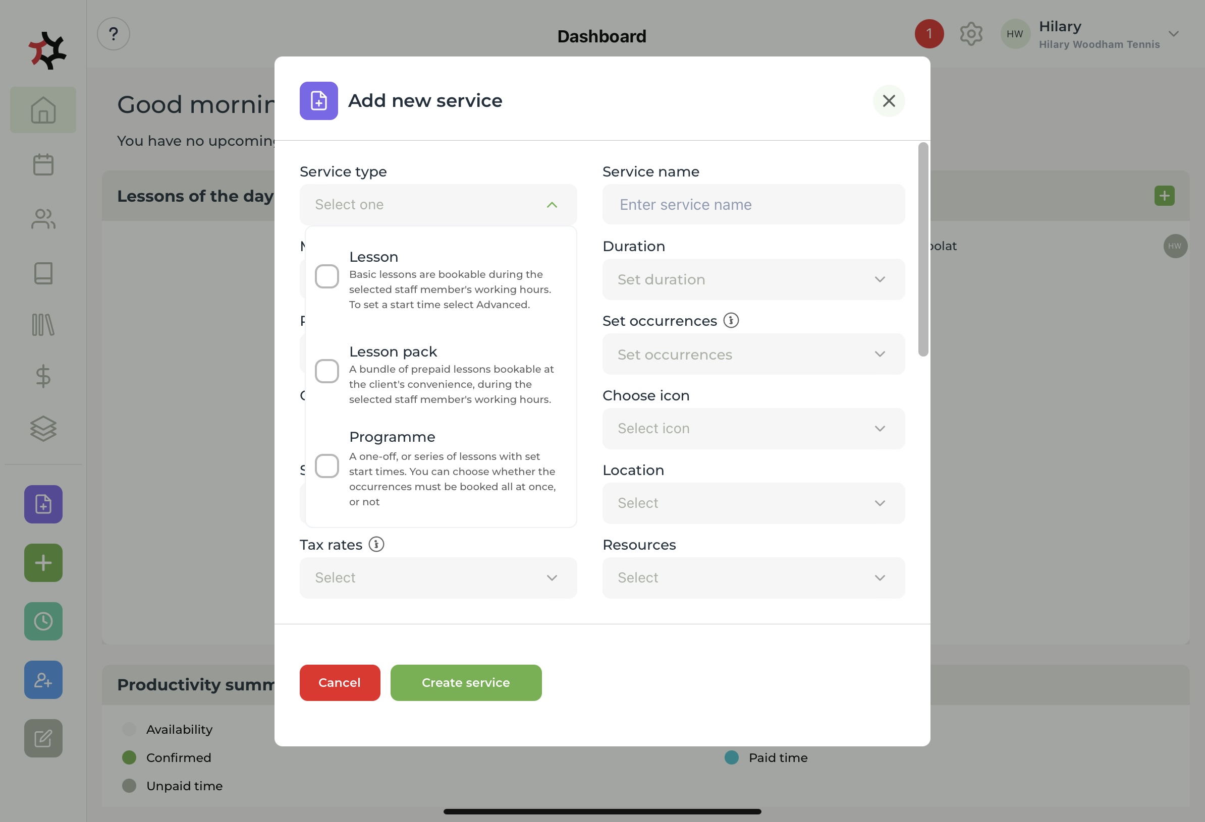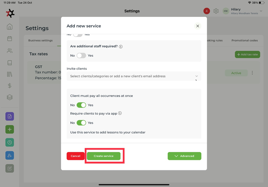 3. Create a **Service name** for your service. For example, Private Lesson or Junior Groups.