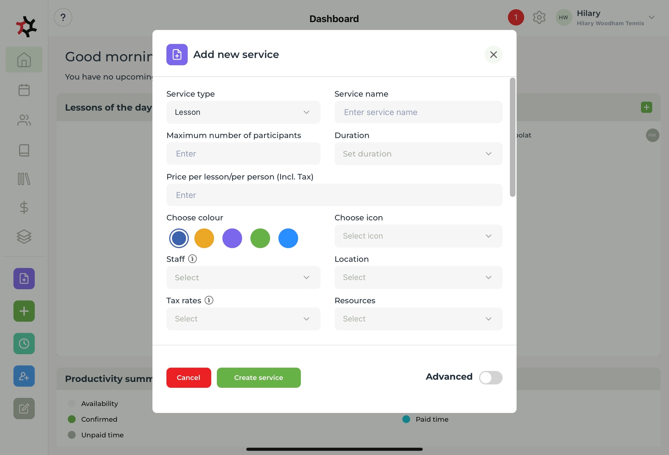 Create a Service name for your service, for example Private Lesson.