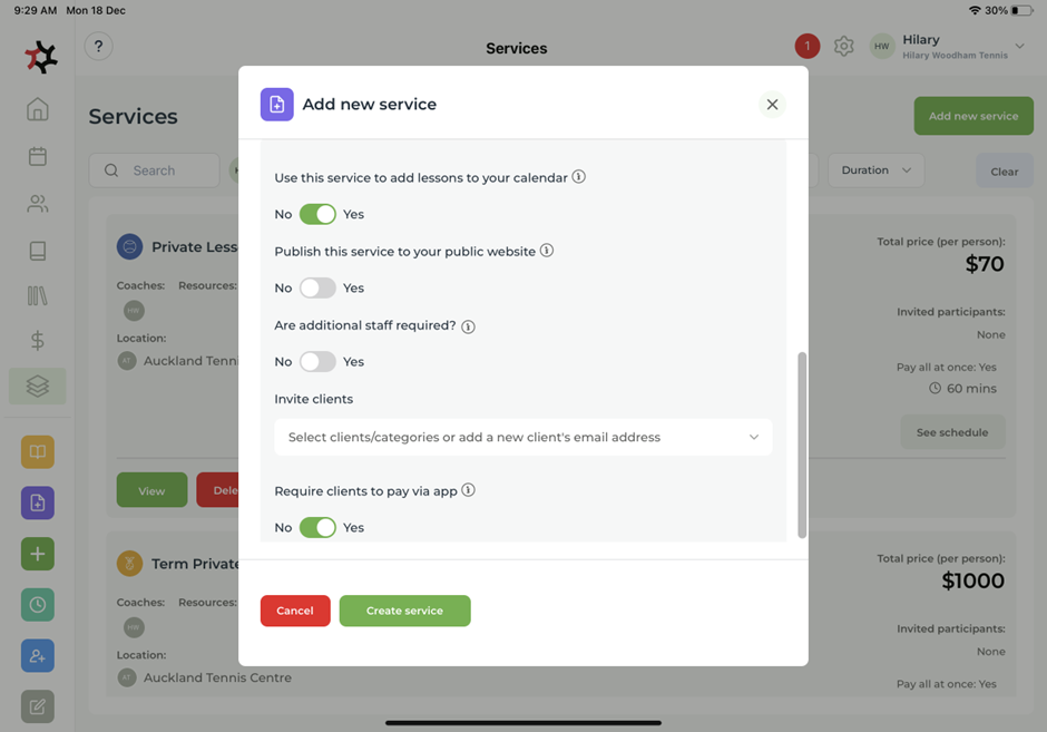 Select whether you would like this service to be in your calendar and your website. You can also add Additional staff and Invite clients.