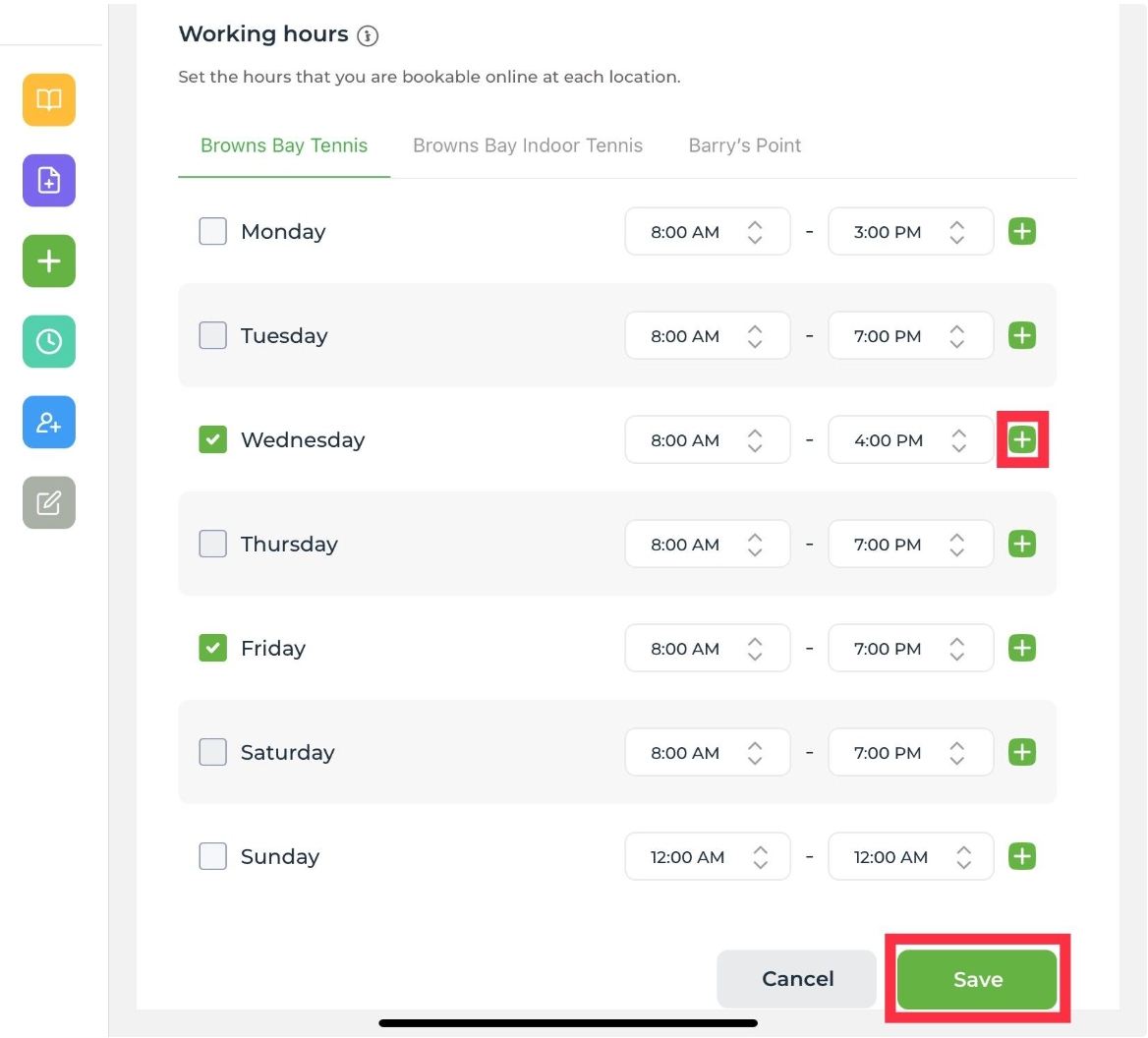 Add working hours for the staff member at each location. You can use the green plus + button to add more than one time period in a day to allow for regular breaks. Staff hours can only be set within the operating hours entered when adding locations.