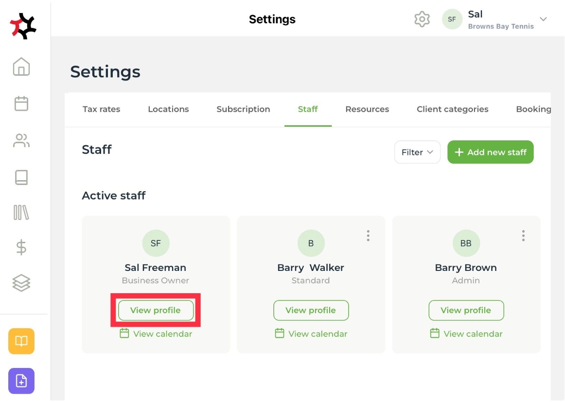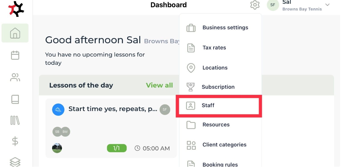 Select the Settings cog on the top toolbar and select Staff.