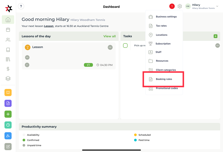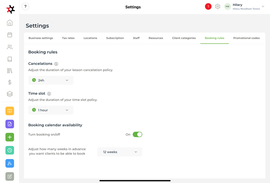 Booking calendar availability. Here you can turn your booking availability on or off, and adjust how many months in advance you want clients to be able to book.
