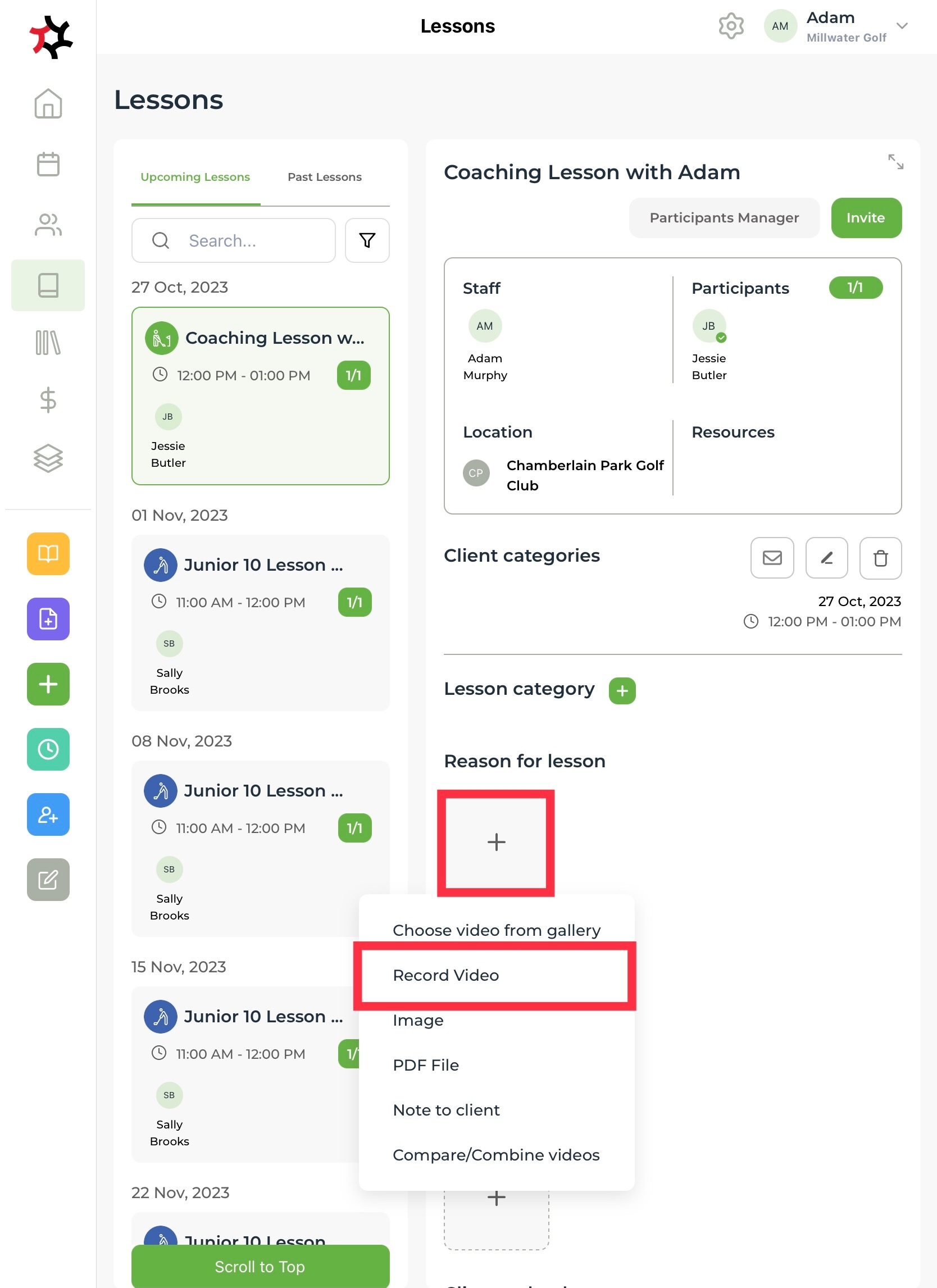 To commence a recording, simply click the + sign within the content tile under any one of the three lesson sections and select Record Video.