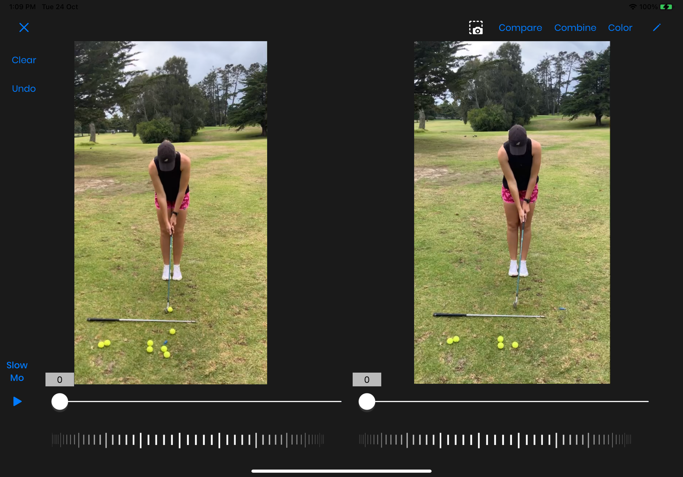 Select the videos you want to Compare/Combine from the device Photo Library, then tap 'Add'. You can now replay both videos simultaneously or individually using the progress bar or scroll wheel.